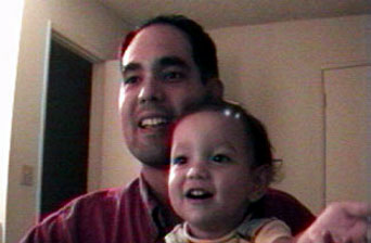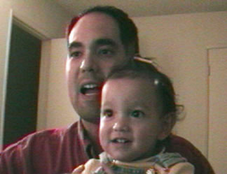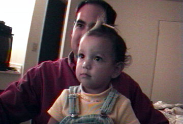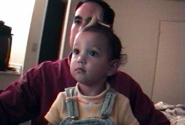 Until I get my next digital camera, you'll have to bear with these still pictures of us in front of the computer. She was wearing a cute outfit and a yellow beret for this sitting. |
