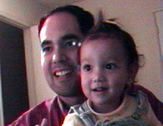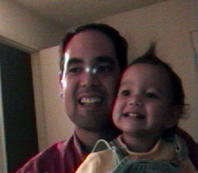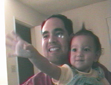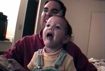 Taylor now has three computer games that we play with together. They are pretty simple, ABCs, numbers, nursery rhymes, etc. But she really likes this one where a talking dog asks you to drag different objects for it to munch on. Promising to play this game with her is how I bribe her to sit for these pictures.For some reason, in these pictures below we were getting this wierd reflection off the camera lens that makes it look like alien spacecraft headlights are coming out of our heads. |